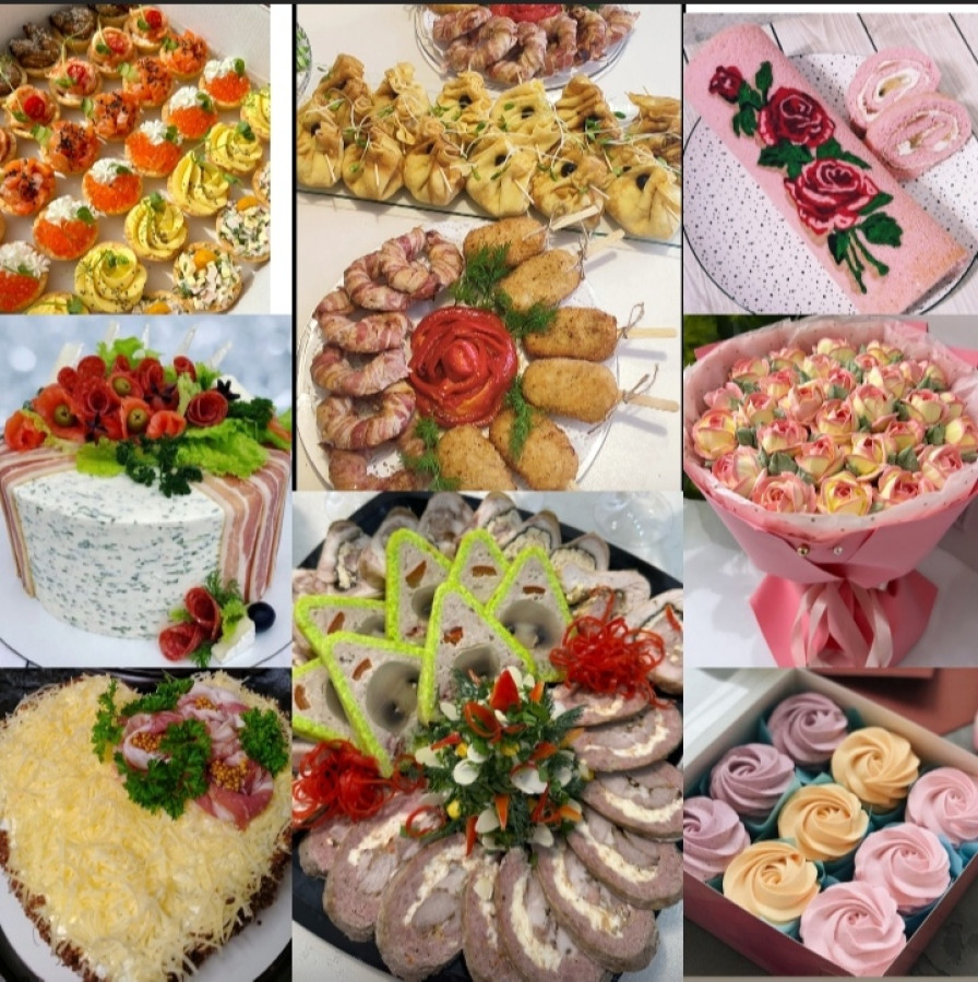 Приготовим вкусную еду для Вашего праздника. Салаты, мясные закуски, горячие блюда, рулеты, закусочные торты, зефир, десерты.